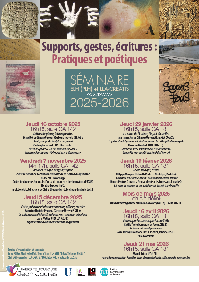 Maud Pérez-Simon présentera jeudi 16 octobre dans le séminaire : « Supports, gestes, écritures : pratiques et poétiques » à l’Université Toulouse – Jean Jaurès une communication sur les inscriptions sur les plafonds peints médiévaux. Cette intervention se fera en construira en écho avec celle de Christophe Imbert sur l’épigraphie romaine et la Renaissance (« Vers un imaginaire de ‘la ville monumentale écrite’ : la graphosphère romaine et le legs poétique de l’Humanisme »).