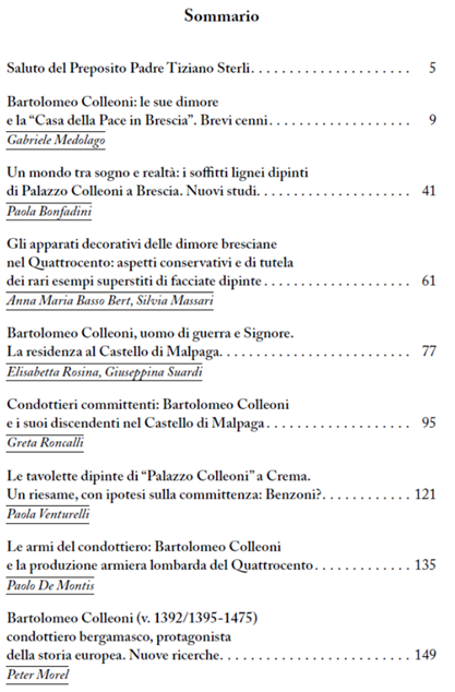 Cet ouvrage, qui dispose d’un beau cahier de photographies, est essentiellement une présentation très complète des décors des plafonds de plusieurs de ses demeures, y compris une enquête concernant un palais de la ville de Crema, parfois considéré comme ayant appartenu au Colleoni. Mais le guerrier qu’est le Colleoni y est vu aussi à travers ses armes, elles-mêmes replacées dans la production particulièrement célèbre et appréciée de cette province dont on oublie souvent qu’elle est aussi montagnarde et riche en mines de fer. Ce colloque montre également que, célébrissime parmi les condottieri italiens, Colleoni ne fut pas seulement un personnage marquant de l’histoire lombarde ou vénitienne, mais une figure européenne, proche du roi René ou de Charles le téméraire, recevant le roi du Danemark dans son château de Malpaga.